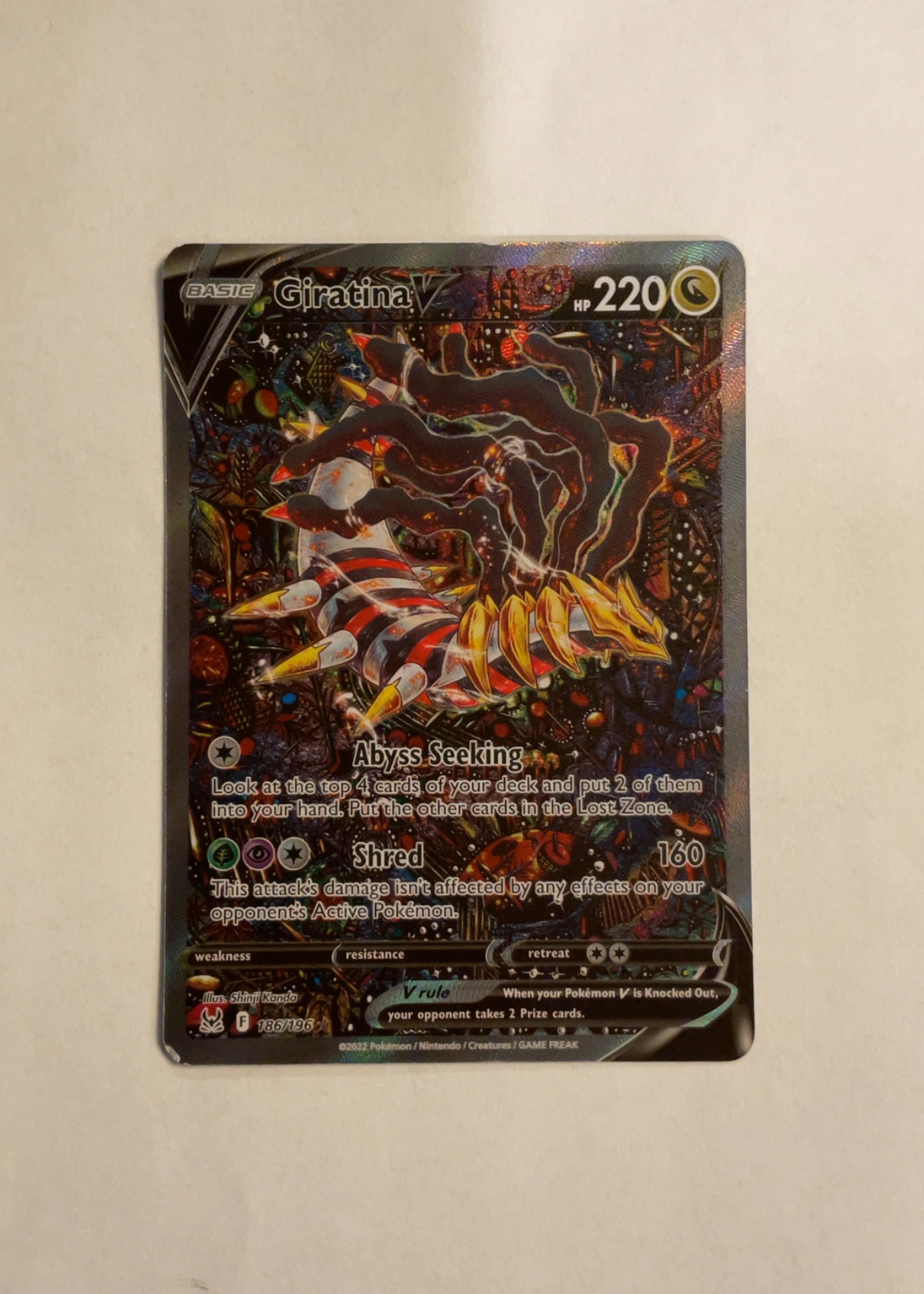 Front holographic surface is vibrant, reflective, and free of visible scratches or scuffs. No print lines or staining observed. Back surface is clean with no creases, scratches, or marks aside from a faint ambiguous dot near the left-center back that may be a photo artifact rather than a card defect.