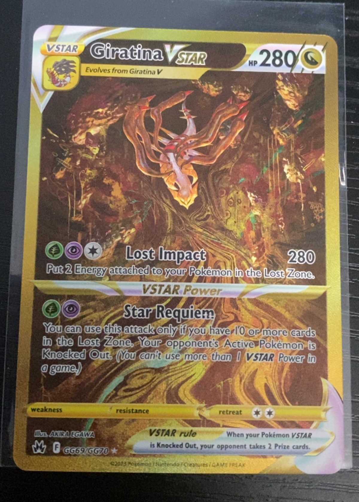 Front surface shows the full-art gold holographic treatment cleanly with no visible scratches, scuffs, or creases. The holo pattern reflects crisply. Back surface appears clean with no scratches, scuffs, or print issues visible.