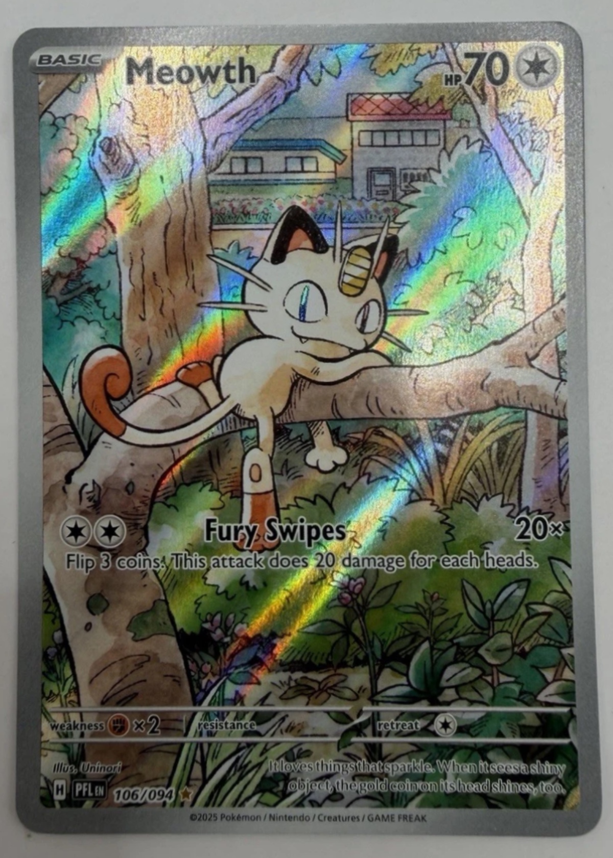 Front: The full-art illustration rare surface displays excellent holographic rainbow pattern across the entire card. The silver finish is clean with no visible scratches, scuffs, or print lines. The artwork of Meowth in the tree is sharp and vibrant. Back: The standard Pokemon card back shows a clean, unblemished surface with crisp printing. The Pokeball design and text are clear with no scratches or surface imperfections.