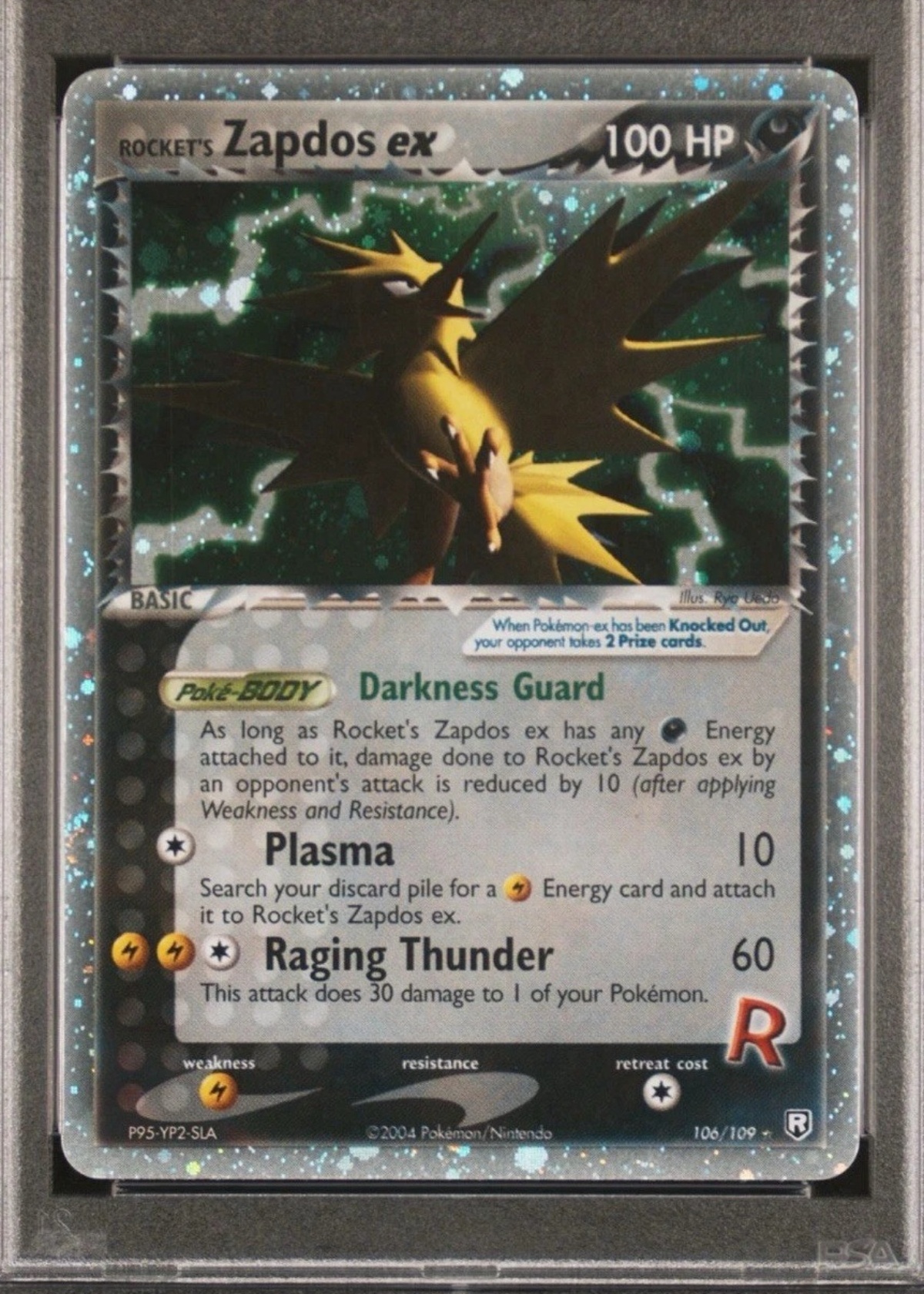 Front holographic surface is vibrant and clean with no visible scratches or scuffs on the sparkle-holo pattern. Text box and artwork area show no print defects. Back surface is clean with no creases or surface damage.